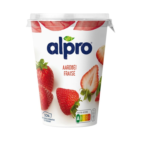 | Ingredients | INGREDIËNTEN: SOJABASIS (water, gepelde SOJABONEN (9,7%)), aardbei (10,9%) (fruit (7%), sap uit concentraat (3,9%)), suiker, zuurteregelaars (citroenzuur, natriumcitraten, appelzuur), stabilisator (pectinen), tricalciumfosfaat, rodebietenextract, natuurlijke aroma's, zeezout, wortelextract, antioxidanten (tocoferolrijk extract, vetzuuresters van ascorbinezuur), vitaminen (B2, B12, D2), yoghurtculturen / -fermenten (S. thermophilus, L. bulgaricus).Kan sporen van noten (geen pindanoten) bevatten.Vrij van zuivel en gluten. Van nature lactosevrij. |