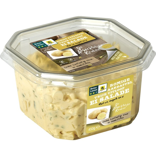 | Ingredients | Ingrediënten :38% aardappel, 28% vrije UITLOOPKIPPENEI*, water, raapolie, suiker, ui, azijn, augurk, zout, vrije UITLOOPKIPPENEI-EIGEEL*, maïszetmeel, gemodificeerd maïszetmeel, MOSTERDZAAD, conservee |