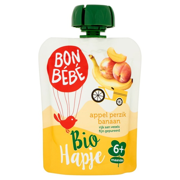 | Ingredients | Ingrediënten :50% Appelpuree*, 40% perzikpuree*, 10% banaanpuree*, antioxidant: ascorbinezuur. *van biologische oorsprong |