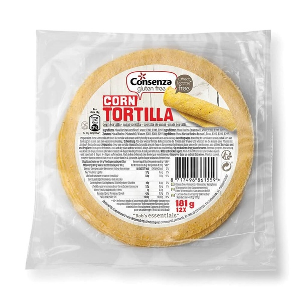 | Ingrediënten (allergenen in kapitalen) | Masa Harina (maïsmeel), water, E202, E282, E297. |