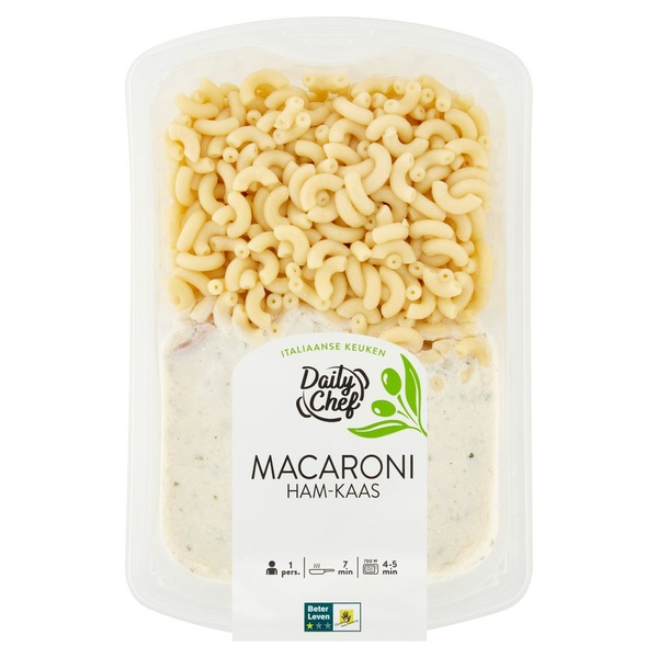 | Ingrediënten | Ingrediënten :50% Gekookte macaroni (water, TARWEGRIESMEEL, raapzaadolie), 50% ham-kaassaus (water, 24% gekookte ham (60% varkensvlees*, water, aardappelzetmeel, nitrietpekelzout (zout, conserveermiddel: E250), specerijen, dextrose, antioxidant: E301, emulgator: E450), 9% Goudse kaas (MELK, zout, zuursel, microbieel stremsel), 8% kaas (MELK**, zout, zuursel, microbieel stremsel), plantaardige oliën (zonnebloem, raapzaad), maïszetmeel, glucosestroop, peterselie, zout, kaliumchloride, specerijen, natuurlijke aroma's (MELK), verdikkingsmiddel: xanthaangom). *= Beter Leven keurmerk 1 ster **= Beter Leven keurmerk 3 sterren Dit product kan sporen van PINDA bevatten. |