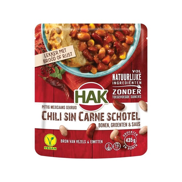 | Ingrediënten | Ingrediënten: Groenten in wisselende verhoudingen 44% (tomaat, tomatenpuree, rode paprika, wortel, mais, gele paprika, ui), bonen in wisselende verhouding 35% (kidney bonen, pinto bonen), water, kruiden en specerijen (chili flakes, komijnzaad, paprikapoeder, cayennepoeder, zwarte peper, oregano), knoflook, raapzaadolie, maiszetmeel, zeezout, champignonconcentraat, cacaopoeder. |
