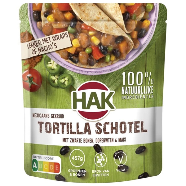 | Ingrediënten (allergenen in kapitalen) | Ingrediënten: Groenten 55% (tomaat 12%, tomatenpuree, rode paprika, doperwt 7%, mais 7%, ui, wortel), bonen 28% (bruine bonen, zwarte bonen 10%), water, knoflook, jalapeñopeper, komijnzaad, zwarte peper, paprikapoeder, uienpoeder, raapzaadolie, maiszetmeel, champignonconcentraat, zeezout, natuurazijn. |
