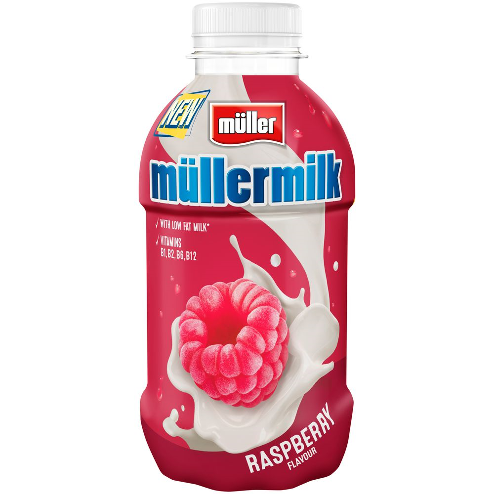 Ingrediënten (allergenen in kapitalen) | 60% halfvolle MELK, KARNEMELK, suiker, WEIproduct, gemodificeerd zetmeel, 0,06% frambozensapconcentraat, kleurstof (karmijnzuur), stabilisator (carrageen), aroma, thiamine (B1), riboflavine (B2), vitamine B6, vitamine B12. |