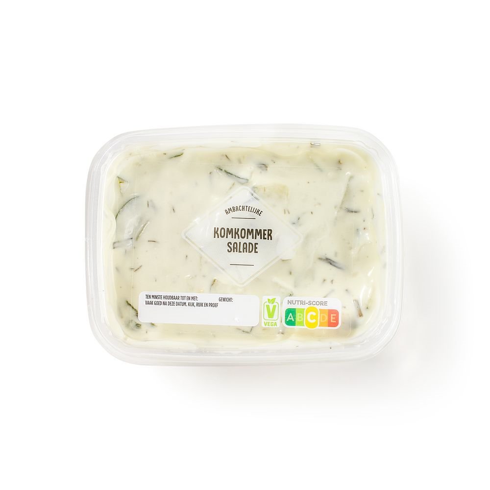 | Ingrediënten (allergenen in kapitalen) | Ingrediënten :56% komkommer, water, raapzaadolie, suiker, maïszetmeel, VRIJE-UITLOOPKIPPENEI-EIGEEL, azijn, zout, gemodificeerd maïszetmeel, verdikkingsmiddel: E415, conserveermiddel: E202/E211, bieslook, dille, voedingszuur: E330. |