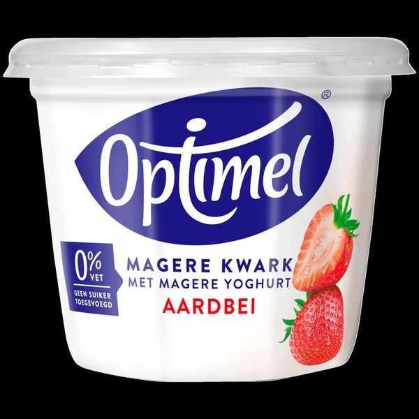 | Ingrediënten | Ingrediënten: Magere kwark met 20% magere yoghurt, vloeibare melkbestanddelen, 8% vruchten (6% aardbei, 2% framboos), gemodificeerd maïszetmeel, gelatine, aroma, kleurstof: karmijn, zoetstoffen: acesulfaam-K en sucralose, calciumrijke minerale melkbesta |
