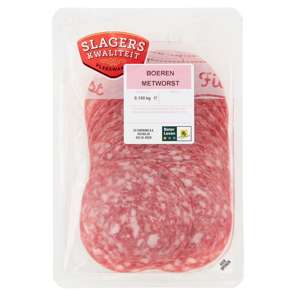 | Ingrediënten (allergenen in kapitalen) | Ingrediënten :Varkensvlees*, zout, varkensvet*, rundercollageen, kaliumzout, geconcentreerd bietensap, dextrose, varkenscollageen, natuurlijk aroma, specerijen, antioxidant: E301, varkenseiwit, conserveermiddel: E250, rook. * = Beter Leven keurmerk 1 ster. Voor 100 gram boerenmetworst is 116 gram vlees gebruikt. |