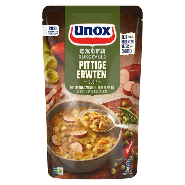 | Ingrediënten (allergenen in kapitalen) | Water, groenten¹ 35% (erwt 24%, wortel 4,2%, prei 4,2%, ui 2,4%), rookworst 6,8% (varkensvlees² 5,7%, separatorvlees 0,17%, water, zetmeel, zout, rookaroma, stabilisatoren (E451, E452, E250), collageen (varken, rund), varkensvet, voedingszuur E330, specerij-extracten, peper, antioxidant E301, dextrose, suiker, houtrook), aardappel¹, katenspek 3% (varkensvlees² 2,8%, zout, stabilisator (E450, E451, E250), rookaroma, antioxidant E301), raapzaadolie, sambal oelek 0,6% (rode peper 0,32%, water, zout, azijn, gemodificeerd zetmeel), gemodificeerd maïszetmeel, gistextract (bevat GERST), gejodeerd zout, specerijen (paprika, cayennepeper, SELDERIJZAAD), kruiden¹ (SELDERIJBLAD, laurierblad), zout, knoflookpuree, aroma, witte wijnextract, balsamicoazijnpoeder (wijnazijn, druivenmost). Kan andere glutenbevattende granen, ei, melk, mosterd, soja bevatten. ¹op duurzame wijze geteeld. ²Beter Leven keurmerk 1 ster. |
