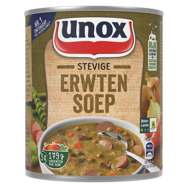 | Ingrediënten | Ingrediënten: Groenten 67,6% (erwt¹ 56%, wortel¹, prei¹, ui¹, BLADSELDERIJ), water, rookworst² 11% (varkensvlees 81%, varkensseparat orvlees 9%, water, varkensvet, zout, dextrose, suiker, varkenscollageen, houtrook, aroma, conserveermiddel E250), aardappel, raapzaadolie, gemodificeerd maïszetmeel, zout, gistextract (bevat GERST), fructose, rookaroma, aroma, specerijen (SELDERIJZAAD, peterseliewortel¹), laurierblad, witte wijnextract, balsamicoazijn (wijnazijn, druivenmost). Kan ei, melk, mosterd, soja bevatten. ¹op duurzame wijze geteeld. ²Beter Leven keurmerk 1 ster |