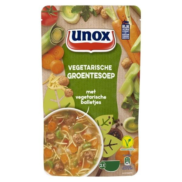| Ingrediënten | Ingrediënten: Water, groenten¹ 12,2% (wortel 4,8%, BLEEKSELDERIJ 2,4%, prei 1,8%, KNOLSELDERIJ 1,6%, tomaat, peterseliewortel), vegetarische balletjes 5,4% (water, plantaardig eiwit (SOJA, TARWE, GLUT |