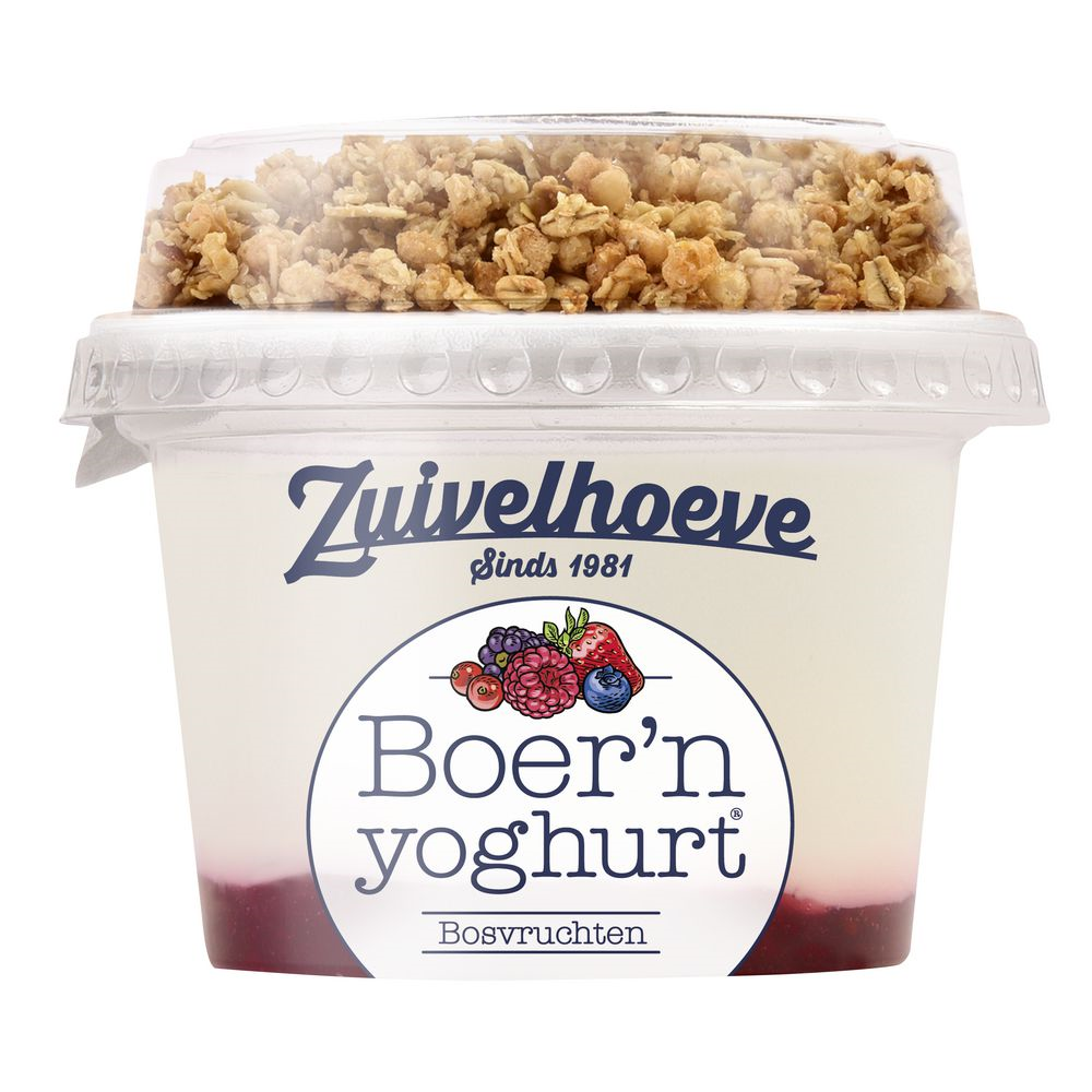 | Ingrediënten (allergenen in kapitalen) | Ingrediënten: YOGHURT, 10% muesli [HAVERVLOKKEN, suiker, zonnebloemolie, glucose-fructosestroop, TARWEVLOKKEN, kokos, HAZELNOOT, rijstebloem, TARWEMOUT, TARWEMEEL, TARWEGLUTEN, dextrose, invertsuiker, zout, GERSTEMOUT, melasse, antioxidant (tocoferolrijk extract)], 6% bosvruchten (aardbei, braam, rode bessensap, bosbes), suiker, MELKEIWIT, maïszetmeel, verdikkingsmiddelen (guarpitmeel, pectinen), natuurlijk aroma, citroensapconcentraat, druivenconcentraat. |